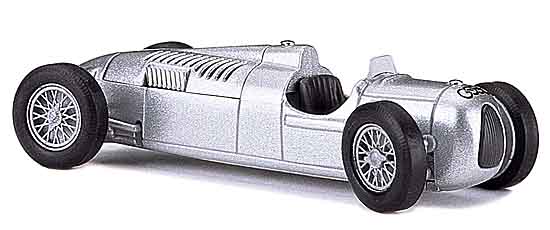 Das Modell des Rennwagens besteht aus insgesamt 35 Einzelteilen, die alle in aufwendiger Handarbeit zusammengesetzt werden. Eine absolute Innovation ist die funktionsfähige Lenkung, bei der wie im Original die Vorderräder über das Lenkrad nach links und rechts eingeschlagen werden können. Die Motorhaube mit dem darunter liegenden 16-Zylinder Motor, ist ein separates Teil und abnehmbar. Die durchbrochenen Lüftungsschlitze sind ebenso realisiert wie die Öffnungen für die 16 verchromten Auspuffrohre. Weitere Details: durchbrochene Speichenfelgen, Metallic-Lackierung, eingesetzte Frontscheibe, feine Bedruckung und verschiedene verchromter Kleinteile. Artikel-Nummer des Grundmodells: 46900 Historie: In den Jahren 1934 bis 1939 wurde das Grand-Prix Geschehen von zwei deutschen Teams beherrscht. Auf den damals engen und meist baumgesäumten Pisten fanden packende Zweikämpfe zwischen den Silberpfeilen von Mercedes und Auto Union statt. Das bekanntere war sicherlich das Mercedes-Team mit Erfahrungen und Erfolgen seit den automobilen Anfängen. Doch die erst 1932 gegründete Auto Union etablierte sich unter Leitung des genialen Professor Ferdinand Porsches in kürzester Zeit in der Weltspitze des Automobilsports. Für den Entwurf und den Bau eines Grand-Prix-Wagens der 750-kg-Formel verantwortlich zu sein, stellte für Porsche und sein Team eine hochinteressante Herausforderung dar. Porsches Entwürfe für den ersten Silberpfeil der Auto Union basierten nicht etwa auf vorhandenem Material, sondern fingen buchstäblich bei Null an. Seine Konstruktionspläne trafen in Teilsendungen in den Zwickauer Horch Werken ein und wurden von seinem technischen Projektleiter Dr. Robert Eberan von Eberhorst geprüft und in die Produktion gegeben. Im November 1933 fanden unter Ausschluss der Öffentlichkeit die ersten Testfahrten auf dem Nürburgring statt. Sein offizielles Debüt gab der erste Sechzehnzylinder am 12. Januar 1934 auf der Berliner Avus. Professor Ferdinand Porsche hatte mit dem Typ C ein revolutionäres Konzept entwickelt: Erstmals saß der Motor im Leiterrahmen vor der Hinterachse, das Getriebe steckte im Heck, und das Cockpit für den Fahrer war sehr weit vorne zwischen Motor und Vorderachse. Dieses Grundprinzip überlebte bis in die heutige Formel 1. Mit seinen 520 PS und einem gewaltigen Drehmoment aus 6005 ccm weltweit war der Typ C der weltweit stärkste Formelrennwagen. Das Jahr 1936 war für die Auto Union das erfolgreichste ihrer Renngeschichte. Beim »Internationalen Eifelrennen« feierte die Auto Union im Juni 1936 mit ihrer Nummer eins im Team, Bernd Rosemeyer, den wohl spektakulärsten Sieg. Als nach der achten Runde der größte Teil der Strecke im dichten Nebel versank und sich die »Grüne Hölle« in eine Waschküche verwandelte, fuhr Rosemeyer, ohne sein Tempo zu reduzieren das Rennen zu Ende. Mit einem unglaublichen Vorsprung von 2,13 Minuten gewann er von dem großen Tazio Nuvolari auf Alfa Romeo und begann damit seinen Aufstieg zu einer der ganz großen Rennfahrerlegenden des Automobilrennsports. Bei insgesamt 30 Grand-Prix Starts in den Jahren 1935-38 beendete er zehn Rennen als Sieger und jeweils fünf Rennen als Zweiter und Dritter und wurde damit zum erfolgreichsten Grand-Prix Rennfahrer in der Geschichte der Auto Union. |