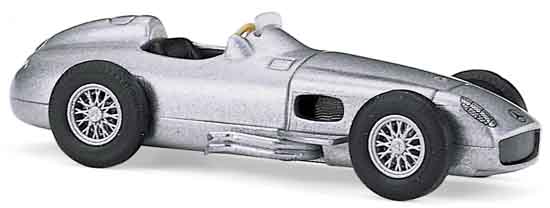 | Das Modell des legendären Silberpfeils ist dem Original von 1954/55 exakt nachgebildet. Modelldetails: Eingesetztes Lenkrad, separate und verchromte Auspuffanlage, zweiteilige durchbrochene Felgen, filigrane Windschutzscheibe, sehr feine Bedruckung u.a. des Mercedes Sterns. Das Megamodell wird in der exklusiven Busch-Sammelbox ausgeliefert. Artikel-Nummer des Grundmodells: 47000 Historie: Die guten Leistungen der Mercedes Rennfahrzeuge über viele Jahre hinweg und die damit verbundene Werbewirksamkeit veranlasste Mercedes 1954 wieder in der Königsklasse des Motorsports anzutreten - der legendäre Silberpfeil, der W 196 wurde gebaut. Der Silberpfeil wurde in zwei unterschiedlichen Rennausführungen eingesetzt. Als Monoposto mit freistehenden Rädern und als Stromlinie mit einer Vollverkleidung, die speziell für Hochgeschwindigkeitskurse konzipiert wurde. In den Jahren 1954 und 1955 schrieb der Silberpfeil dank eines überragenden Juan Manuel Fangio Renngeschichte. In diesen beiden Rennjahren beendete er bei insgesamt 14 Grand-Prix-Starts neunmal das Rennen als Sieger. Mit noch jeweils einem Sieg von Stirling Moss und Karl Kling behauptete Mercedes seine Vormachtstellung gegenüber der Konkurrenz aus Italien und Frankreich. |