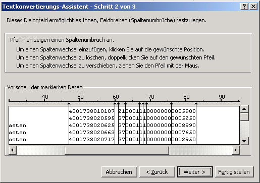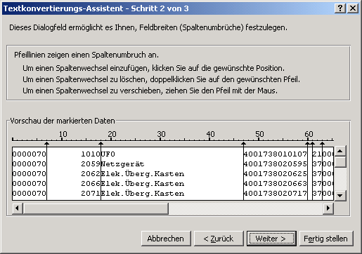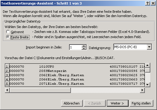 Artikelstammdaten, die im Busch-Data-Format gespeichert sind, können sehr einfach in das Excel-Format konvertiert werden. Bitte beachten Sie hierfür nachfolgende Hinweise: Excel starten. Die Funktion "Datei öffnen" anklicken und als Dateityp "Alle Dateien (*.*)" auswählen. Die zu konvertierende Datei (z.B. "Busch.dat") selektieren. Excel öffnet den Textkonvertierungs-Assistenten. Dort die Eingaben entsprechend folgender Abbildung festlegen: Wird der "Weiter"-Button betätigt, können die einzelnen Felder (Artikelnummer, Bezeichnung usw.) durch Verschieben der schwarzen Linien entsprechend festgelegt werden. Die Positionen der Linien entnehmen Sie bitte nachfolgenden Abbildungen bzw. der Beschreibung "Artikelstammdaten im Busch-Data-Format". Z. B. kommt die erste Linie zur Abgrenzung der Lieferantennummer an Position 7. Die zweite Linie zur Abgrenzung der Artikelbezeichnung folgt an Position 18 usw. (In der Tabelle zur Beschreibung "Artikelstammdaten im Busch-Data-Format" finden Sie die Positionen der Linien für die einzelnen Felder jeweils unter der Spalte "Position bis".) Den Rollbalken (unter der Vorschau) nach rechts verschieben und die restlichen Linien definieren: Um die Daten endgültig zu konvertieren "Fertig stellen" anklicken. Die Excel-Tabelle enthält dann folgende Felder:
