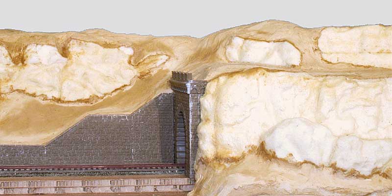 Nach Einbau des Tunnelportals mit Böschungsmauer und Tunnelröhre die restliche Landschaft mit Busch Geländebau-Mörtel 7193 gestalten und die Felsen entsprechend einbinden. Nach und nach ergibt sich das ganz oben gezeigte Bild.