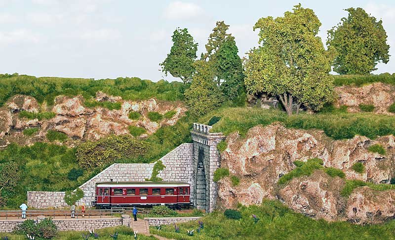 »Unkraut« usw. lässt sich mit Hilfe der Busch Foliage Maigrün 7341 bzw. Mittelgrün 7342 darstellen. Die Lupinen (Busch 1217) gemäß Packungsanleitung herstellen und entsprechend einsetzen. Abschließend Schienen und Tunnelportal mit Trockenfarben patinieren, Zäune und Figuren aufstellen. Jetzt kann der Triebwagen seinen Fahrbetrieb aufnehmen. |